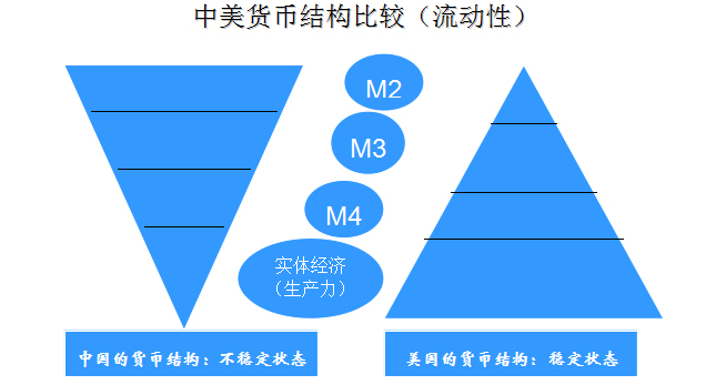 從M3或更多的貨幣層次考察,情況完全不同。美國的M3達到400多萬億人民幣,是中國的3倍,日本達300多萬億人民幣,是中國的2倍。從M3以上的層次考察,美國的貨幣供給更多。中國的貨幣問題不是數(shù)量問題,主要是結(jié)構(gòu)和效率問題?!暗谷切巍钡呢泿沤Y(jié)構(gòu)表明中國金融體系不穩(wěn)定,較易發(fā)生金融動蕩和風險,中國貨幣層次中,M3以下逐步減少,越距實體經(jīng)濟貨幣越少,金融對實體經(jīng)濟的支持小。大量貨幣呈現(xiàn)高流動性,容易引發(fā)通脹。金融資源配置效率低下,資金的信息化程度低,有效產(chǎn)出率不高。美國貨幣結(jié)構(gòu)特征是,貨幣的基礎(chǔ)層次龐大,接近實體經(jīng)濟的貨幣供給充分,金融市場效率高;M3、M4等吸納貨幣功能強,有利于治理通貨膨脹,美國的貨幣層次甚至延伸到全球,為美國治理通脹提供了充分的工具。