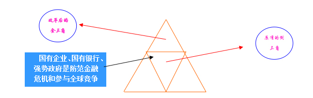 在當前情況下,中國的金融、經(jīng)濟和政府都是一種“倒三角”的結(jié)構(gòu),如圖中的白色部分。這種結(jié)構(gòu)不穩(wěn)定,風險較大,不利于經(jīng)濟結(jié)構(gòu)的調(diào)整和經(jīng)濟的可持續(xù)發(fā)展。金融業(yè)表現(xiàn)為銀行過大,直接融資發(fā)展嚴重滯后,金融資源向國有企業(yè)和政府集中,中小企業(yè)和民營企業(yè)融資非常困難。經(jīng)濟結(jié)構(gòu)的倒三角表現(xiàn)為近幾年,國進民退,央企、國企很大,而民營企業(yè)和中小企業(yè)萎縮。政府結(jié)構(gòu)表現(xiàn)為上強下弱,權(quán)力大服務(wù)小,人治大,法治小。有人建議推倒重來,這是不可以的,要吸取前蘇聯(lián)亡黨亡國的教訓。應(yīng)當繼續(xù)漸進的增量改革,做強做好國有股份制銀行,大力發(fā)展資本市場和金融市場,形成金三角的金融結(jié)構(gòu)。經(jīng)濟方面做好國有企業(yè),大力發(fā)展民營企業(yè)與中小企業(yè)。政府方面要提高效率,形成高效政府和大服務(wù)的組合、依法治國與以德治國的有機結(jié)合。國有企業(yè)、國有銀行、強勢政府是防范金融危機和參與全球競爭的保障和核心競爭力。