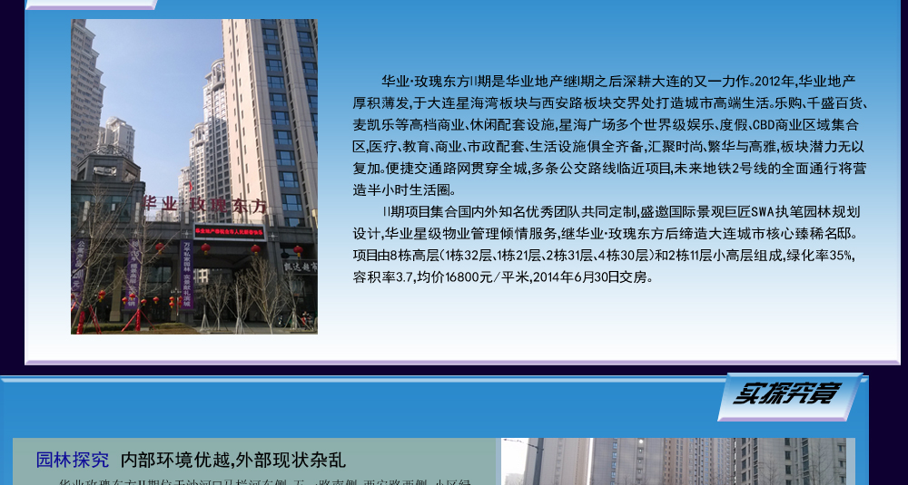 ????說起大連的幾大商圈,西安路與和平廣場(chǎng)不得不提,而位于這兩個(gè)商圈中間位置的華業(yè)玫瑰東方Ⅱ期,成為眾多購房者關(guān)注的焦點(diǎn),本期的神秘訪客我們就實(shí)地探訪華業(yè)玫瑰東方Ⅱ期,看一看它的優(yōu)勢(shì)與不足。