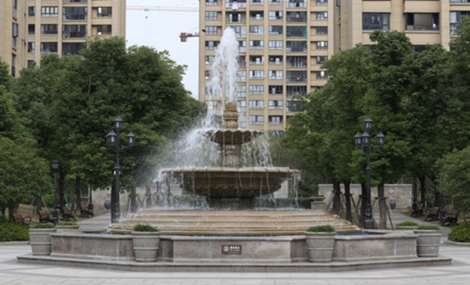 小區(qū)內綠化布置以生態(tài)、綠色為先導,充分利用其樓間距的距離,形成縱深交錯,層層合圍的平面布局。一路走來,花卉植物、雕像噴泉、卵石路徑,滿目皆是。