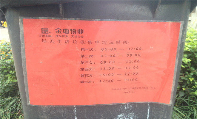 物業(yè)服務(wù)方面業(yè)主總體表示很滿意,其中一位陳姓業(yè)主告訴記者:“小區(qū)內(nèi)定期會有專人進(jìn)行綠化養(yǎng)護(hù)和衛(wèi)生保潔,環(huán)境非常好?!蓖瑫r(shí),記者還發(fā)現(xiàn)基本上小區(qū)內(nèi)垃圾桶上都貼有明確的每日清運(yùn)時(shí)間,非常人性化。
