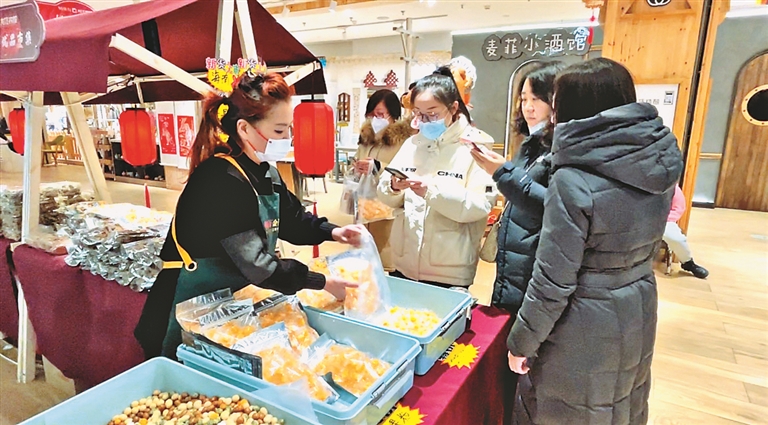年貨攤前顧客絡(luò)繹不絕。本報(bào)見(jiàn)習(xí)記者 李雪君攝