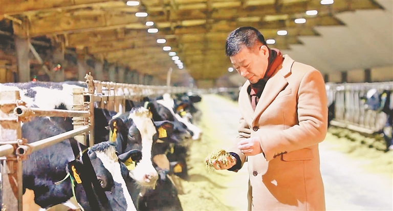 冷友斌查看牧場(chǎng)飼草料質(zhì)量。