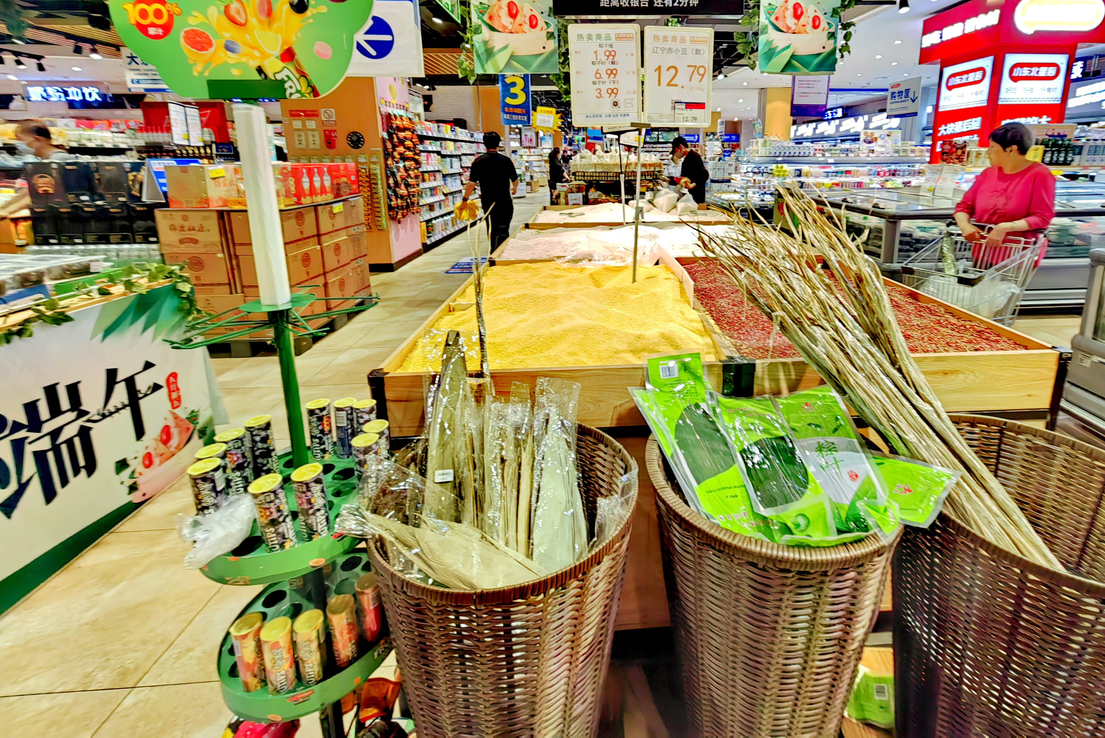 27日,哈爾濱市道里區(qū)一家超市內(nèi),許多市民在購(gòu)買粽子。一些老人則購(gòu)買粽子葉和糯米等原材料,回去親手包制。