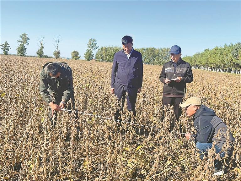 長(zhǎng)水河農(nóng)場(chǎng)農(nóng)業(yè)科技服務(wù)中心與二井鎮(zhèn)農(nóng)技推廣中心技術(shù)人員開(kāi)展田間測(cè)產(chǎn)工作。劉曉巖攝