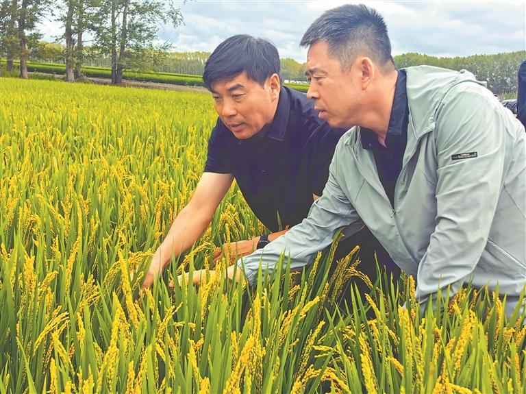 東北農(nóng)業(yè)大學(xué)彭顯龍教授(右)在建三江了解水稻成熟情況。