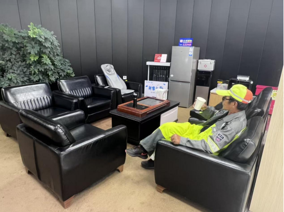 走進營業(yè)廳的 “愛心驛站”,溫暖的氛圍撲面而來:飲用水、充電插座、急救包、休息座椅、報刊讀物等物資一應(yīng)俱全。環(huán)衛(wèi)工人、出租車司機、快遞員等戶外勞動者可以到這里喝杯熱水、歇歇腳,再投入一天忙碌的工作。