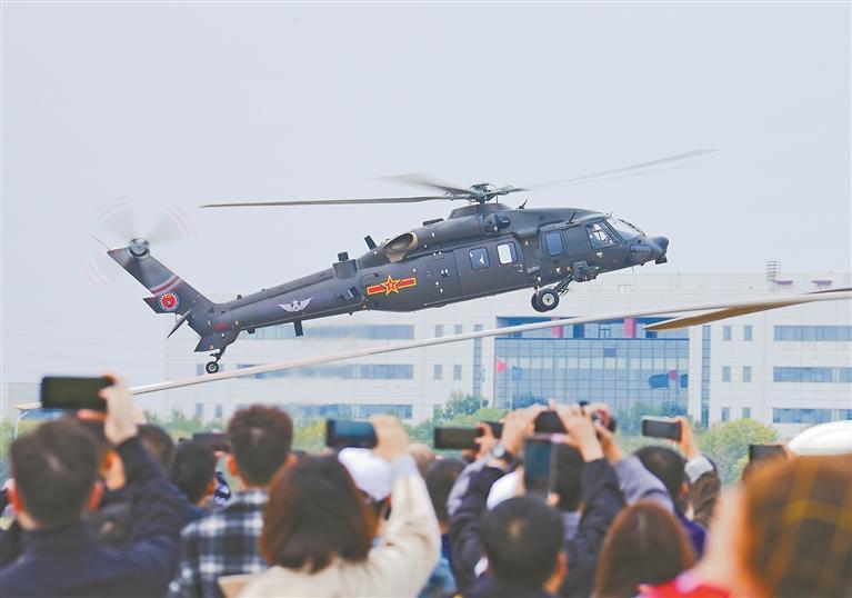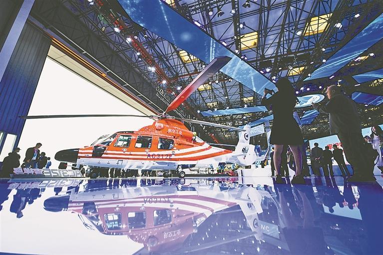 觀眾在天津直博會(huì)直升機(jī)館內(nèi)參觀AC312E直升機(jī)。