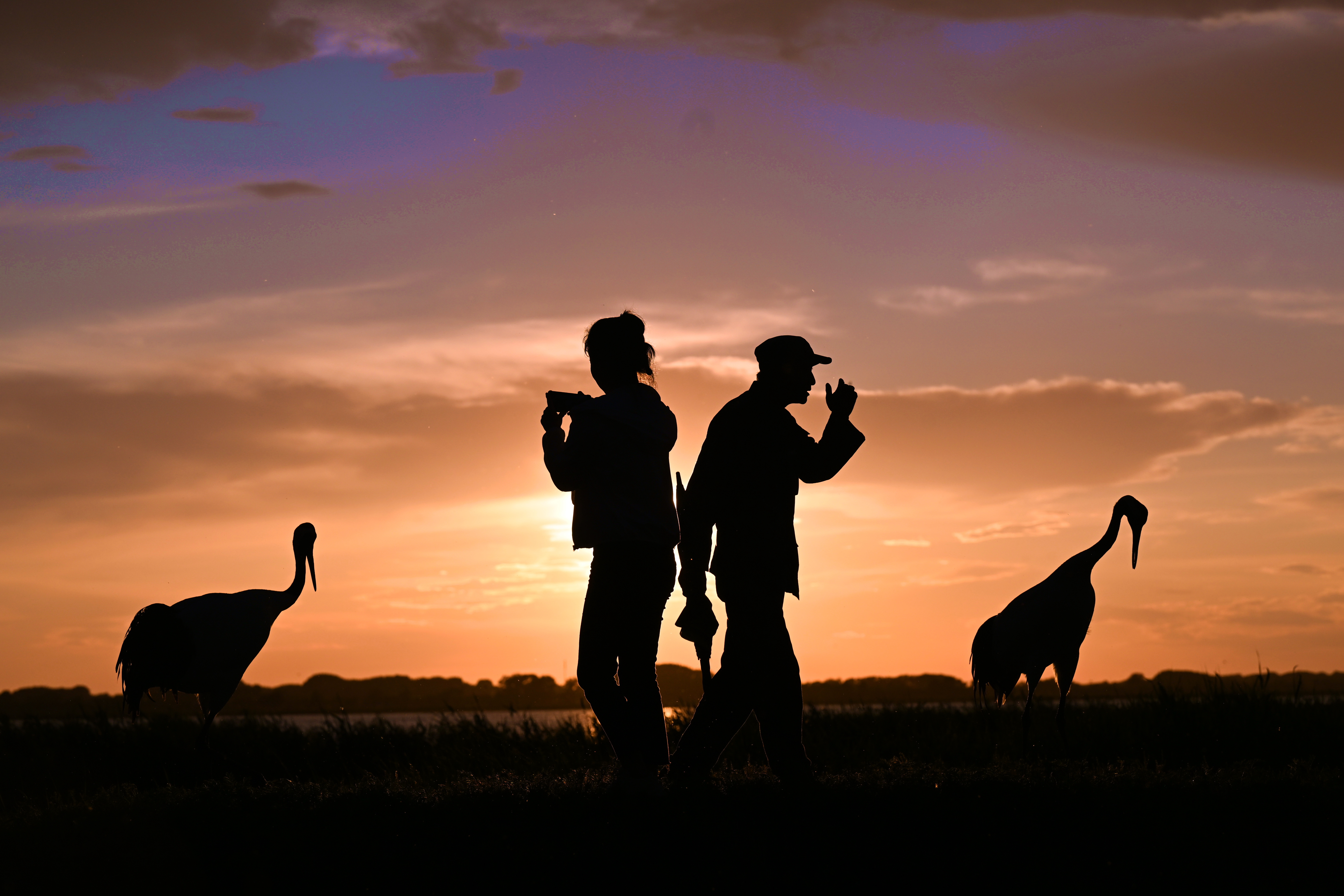 傍晚,徐惠(右)巡訪保護(hù)區(qū)內(nèi)的野生丹頂鶴