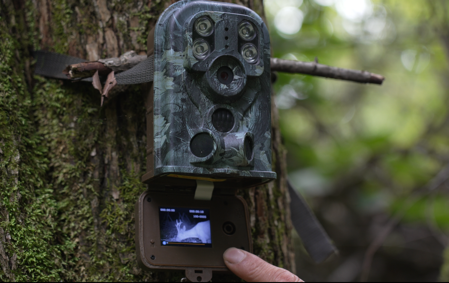 王道輝在林間查看遠(yuǎn)紅外監(jiān)測(cè)相機(jī)