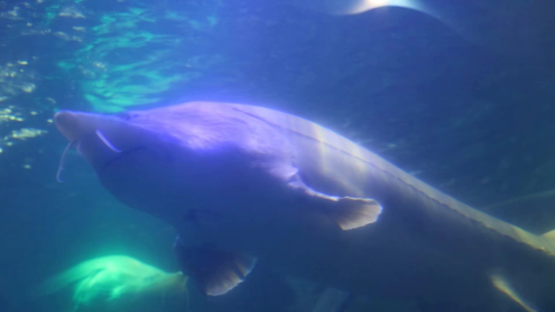 撫遠市魚博館,巨型水族箱內(nèi)上百條鱘鰉魚自在遨游,縱使隔著玻璃,人們也可以清晰地感受到鱘鰉之美。體格碩大的鰉魚,任你用什么樣攝影器材,都很難將其籠罩一鏡之下。