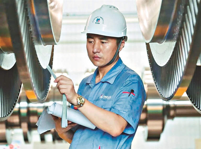 哈電汽輪機質(zhì)量控制部大件檢驗組總裝檢查員王立安檢驗汽輪機轉(zhuǎn)子,確保產(chǎn)品質(zhì)量。