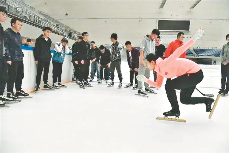 ①張虹為學生講授滑冰技巧。圖片由哈工大全媒體中心提供