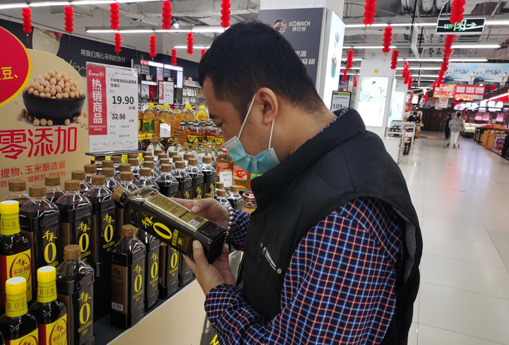 11月2日,在大慶永輝超市萬(wàn)達(dá)店,市民老李正在購(gòu)物。跟往常比較一下商品價(jià)格就放購(gòu)物車(chē)不同,現(xiàn)在,每拿起一樣食品,他都會(huì)仔細(xì)看一看配料表。