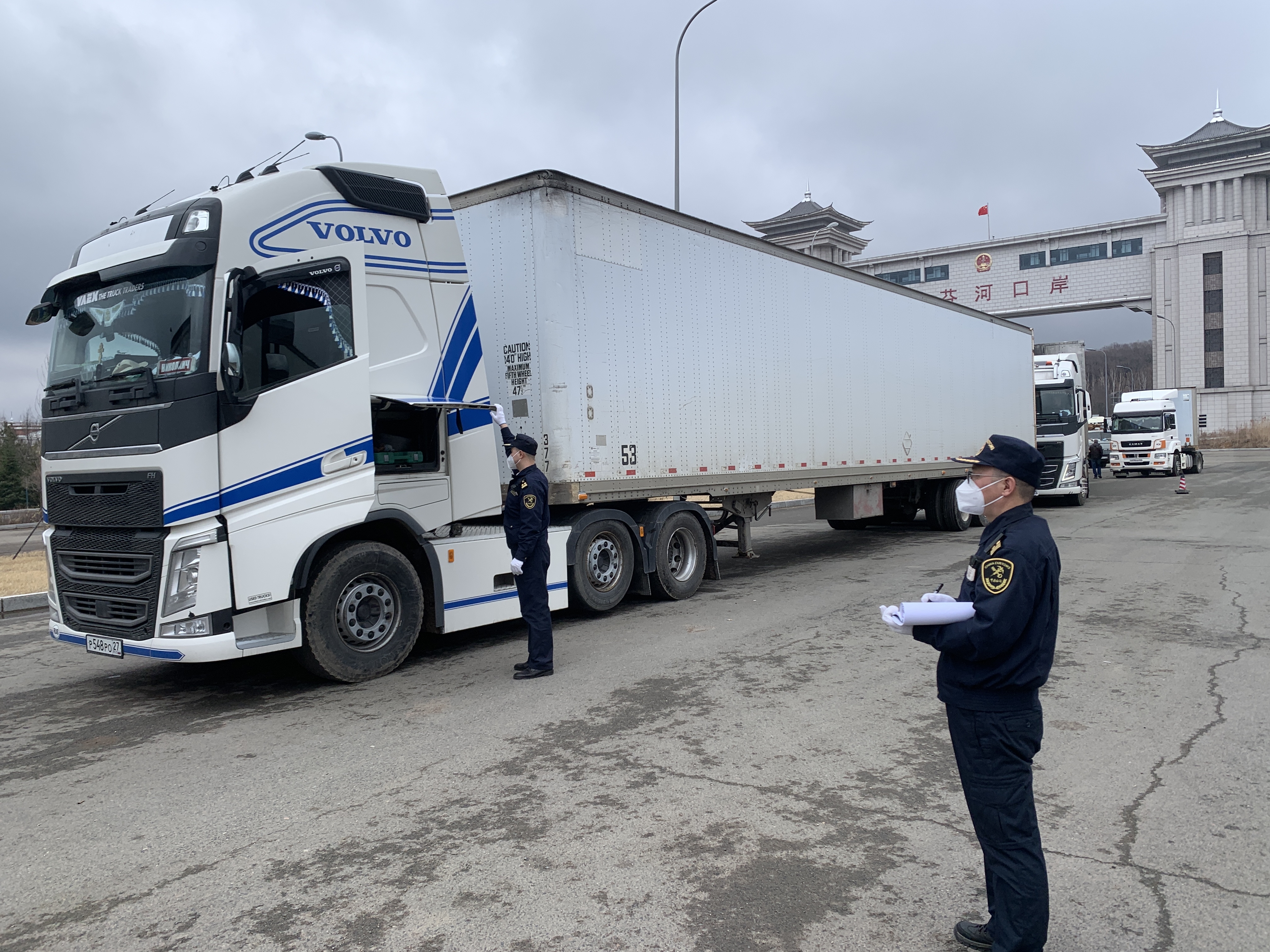 綏芬河海關(guān)關(guān)員對(duì)入境貨車進(jìn)行登臨檢查