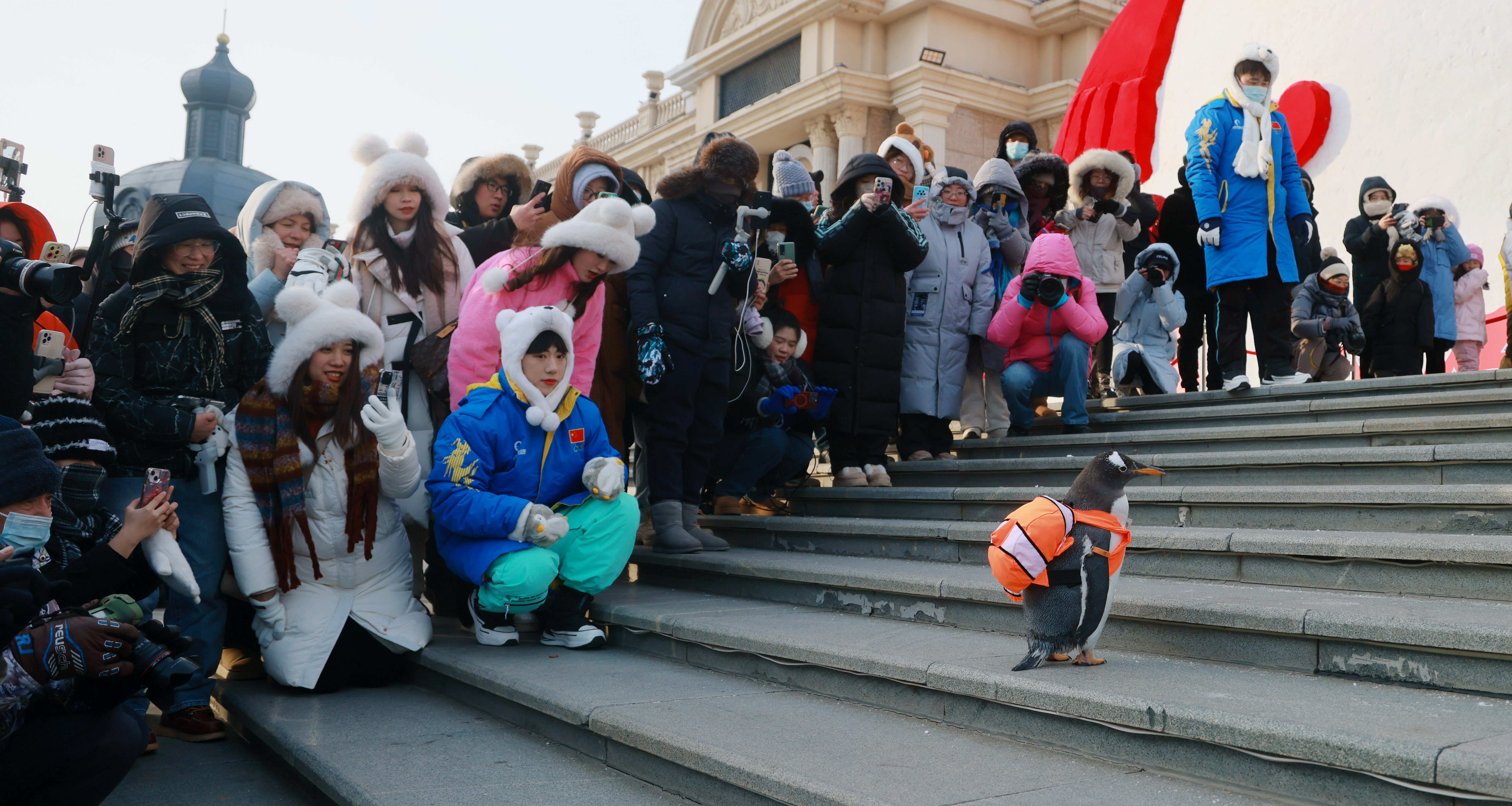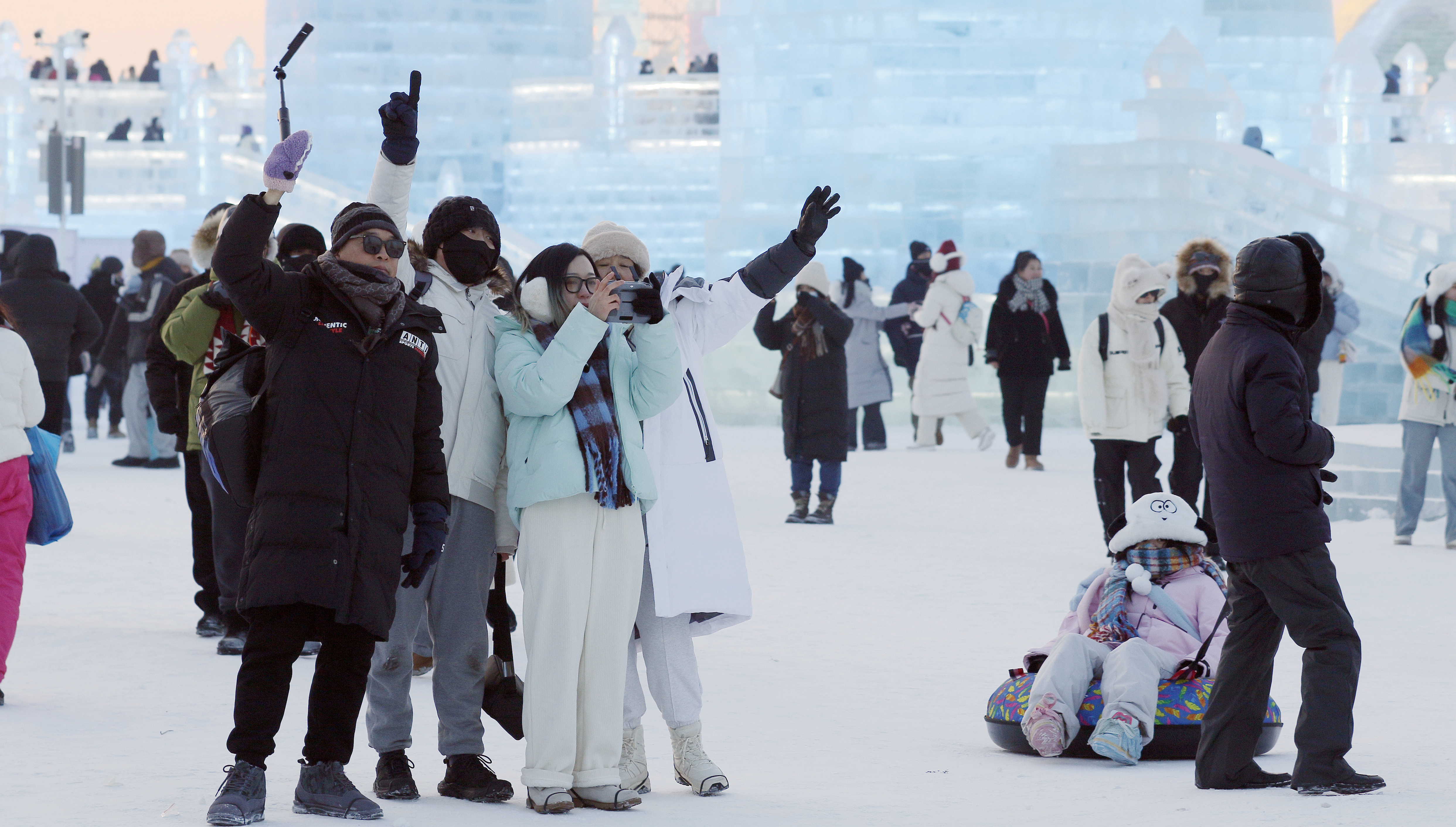 五彩斑斕的“小公主”們和“小金豆”們徜徉在大街小巷,手里的哈爾濱紅腸、馬迭爾冰棍、尹胖子油炸糕,為這個(gè)冬天增添了別樣的韻味。中央大街、紅專街早市、道里菜市場(chǎng)人流熙攘,冰雪大世界、雪鄉(xiāng)、亞布力滑雪場(chǎng)、漠河等地“熱雪沸騰”,酒店和澡堂里一排排行李箱拉滿氛圍,淘學(xué)企鵝憨態(tài)可掬、大雪人溫暖治愈,萬(wàn)人大蹦迪、超級(jí)冰滑梯、潑水成冰……勾勒出一幅幅風(fēng)情絕美的“北國(guó)畫卷”。