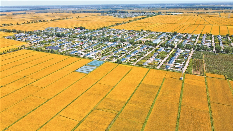 進(jìn)入秋季,盤錦市大洼區(qū)唐家鎮(zhèn)北窯村附近的金色稻田一片豐收景象。遼寧日?qǐng)?bào)記者 楊靖岫攝