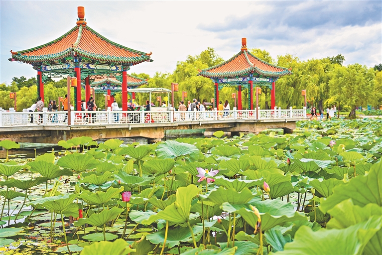 每年夏日,長春市南湖公園荷花盛開,吸引市民駐足觀賞。吉林日?qǐng)?bào)記者 張野攝