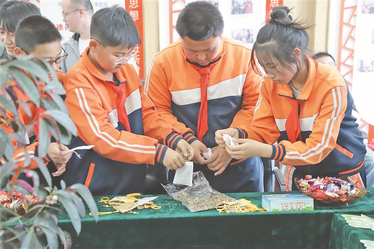 小學(xué)生們制作端午節(jié)香囊。