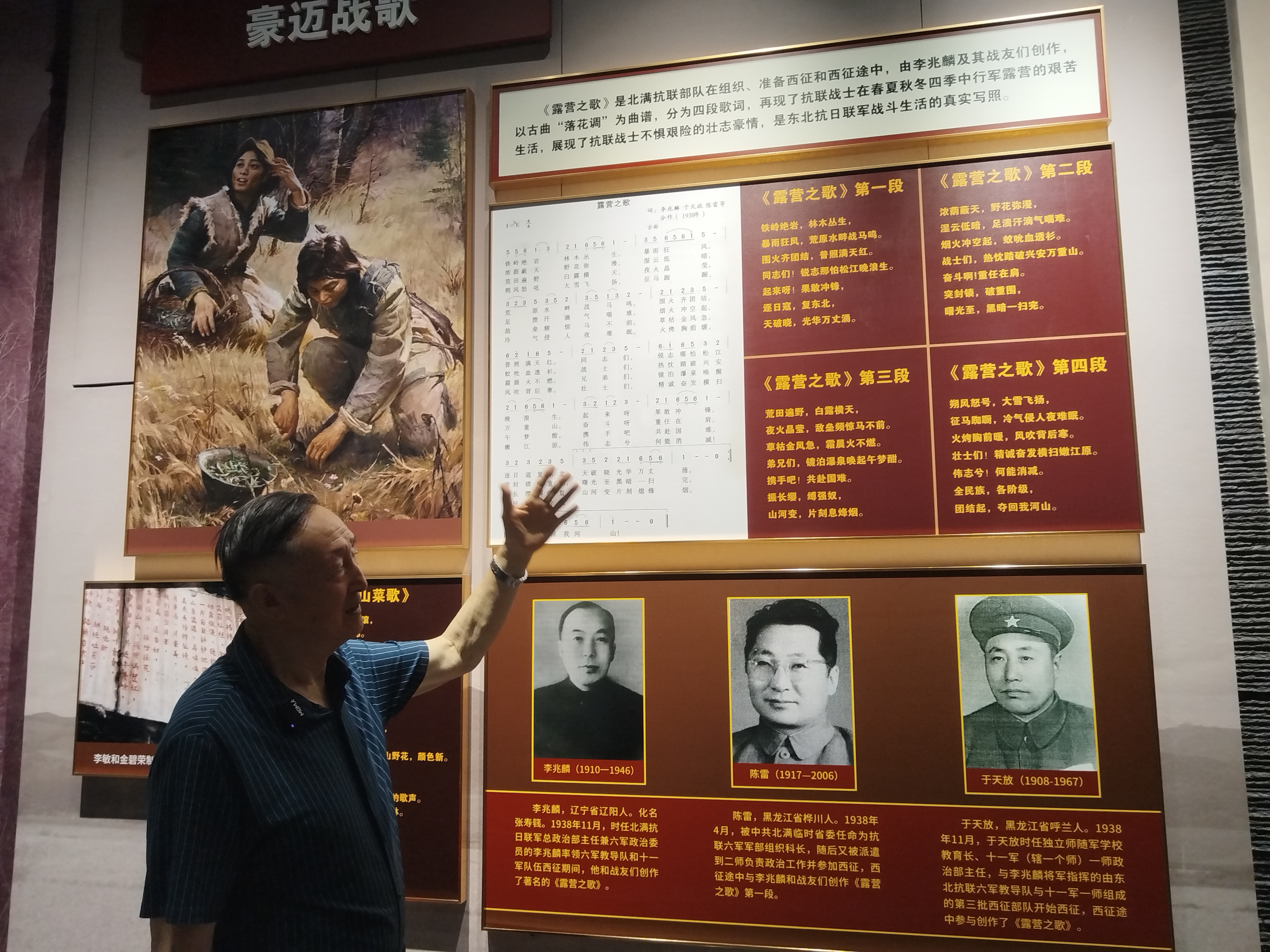 在“密營文化 閃耀光輝”第三單元《豪邁戰(zhàn)歌》展板前,廖懷志駐足良久,滿懷深情地向記者介紹起《露營之歌》的誕生。