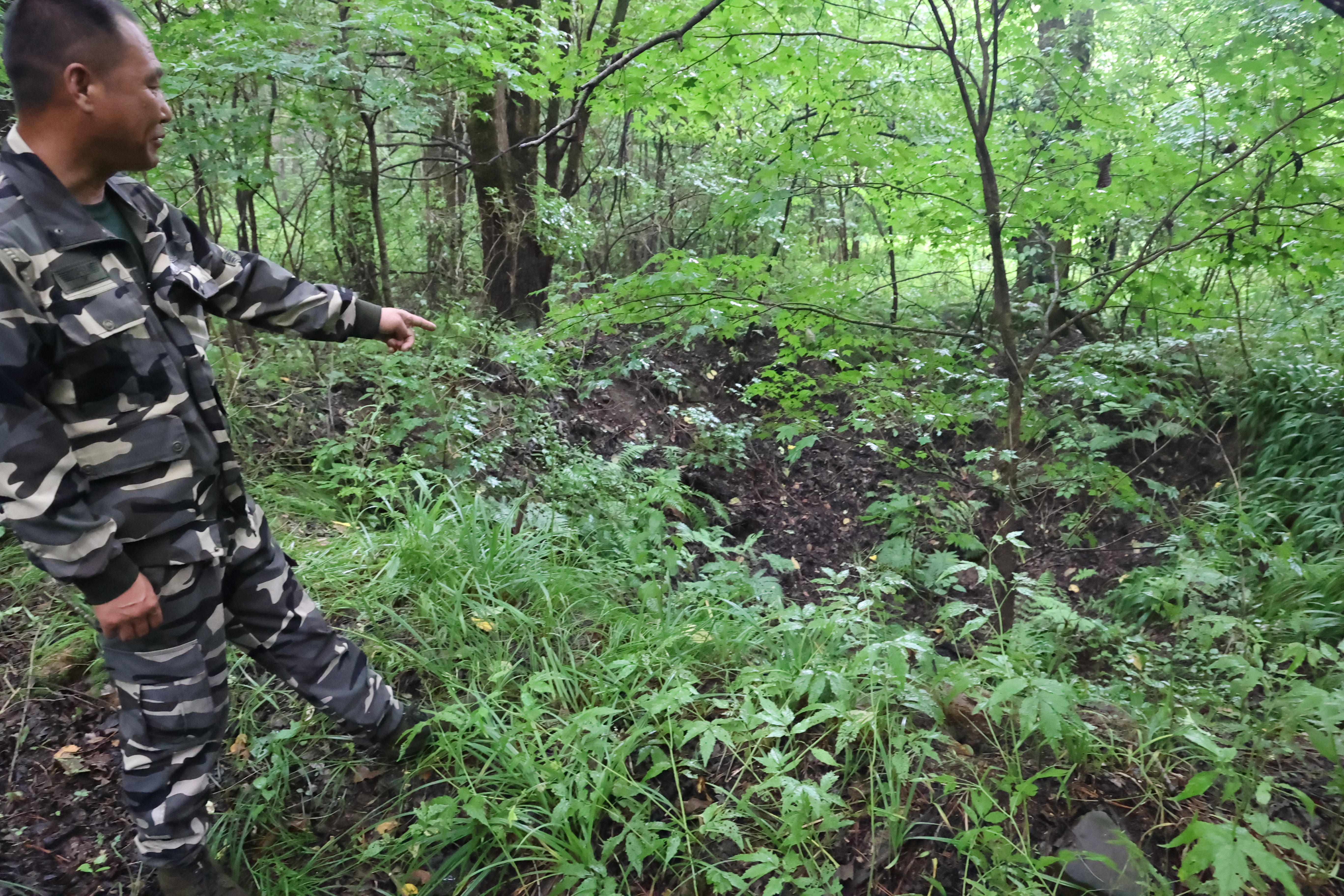 盡管歲月的風(fēng)雨讓密營的輪廓變得模糊不清,但仍能看出其大致布局?!斑@里就是當(dāng)年抗聯(lián)戰(zhàn)士居住的鷹窩密營遺址。別看現(xiàn)在安安靜靜的,八十多年前,可是戰(zhàn)火紛飛?!蓖械那搴泳止拘麄鞑坎块L管天遠(yuǎn)介紹道。