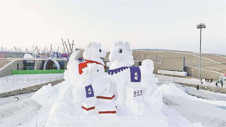 為迎接即將到來(lái)的生肖馬年,哈爾濱冰雪大世界結(jié)合“冰天雪地 童話世界”主題,對(duì)雪雕形象進(jìn)行了童話主題創(chuàng)作,同時(shí)聽(tīng)取游客意見(jiàn),雕刻了小馬一家四口。