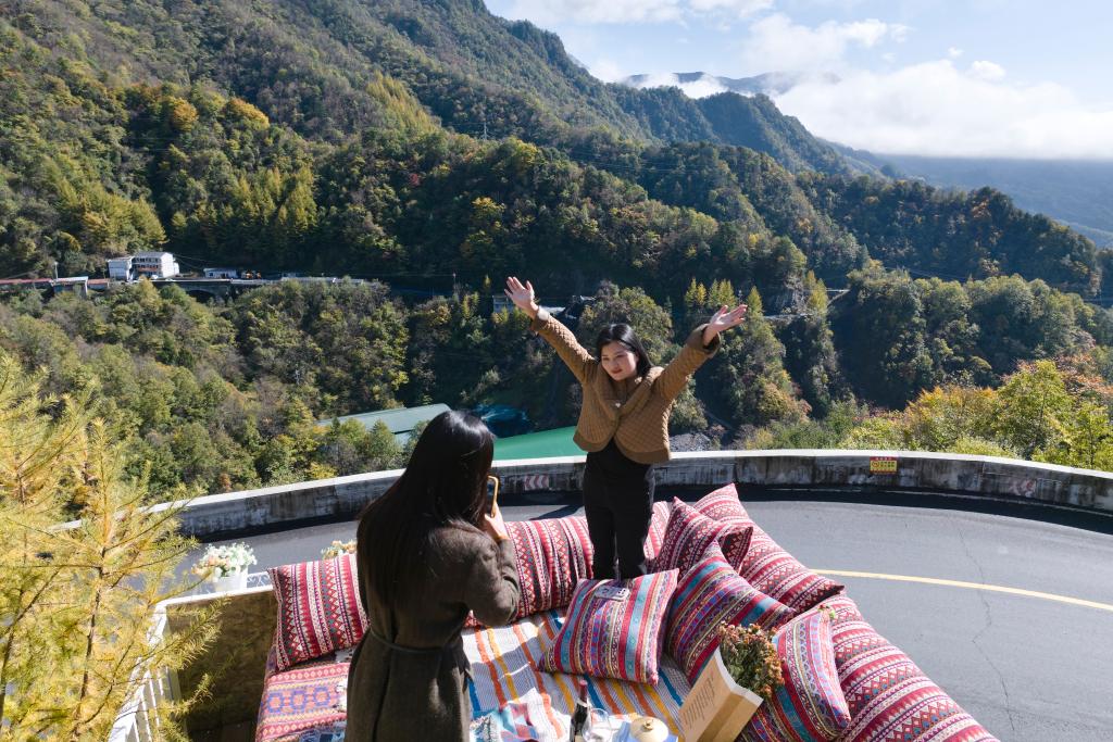 2025年10月30日,游人在安康市镇坪县化龙山一处咖啡馆的露台上拍照(无人机照片)。新华社记者邵瑞 摄