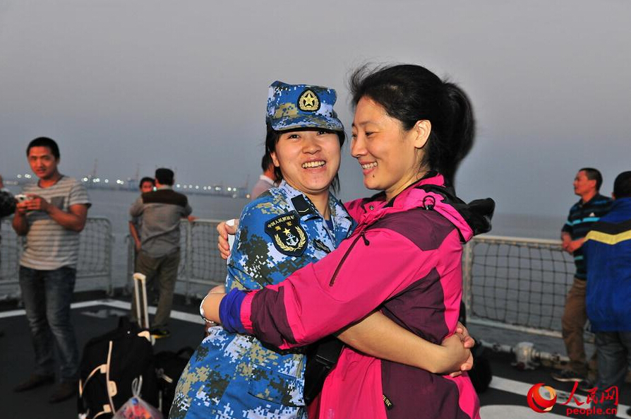 圖為濰坊艦艦員與同胞擁抱告別。熊利兵 攝