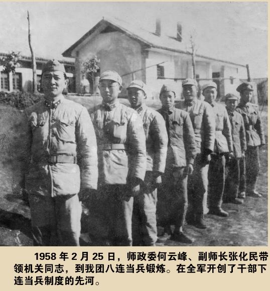 ????1958年8月,毛澤東主席在北戴河召開的中央政治局?jǐn)U大會議上講話指出:“我們的軍官,像云南的一個師長,一年當(dāng)一個月兵,我看這是好辦法?!@樣,我們的軍隊(duì)就是永遠(yuǎn)打不散的軍隊(duì)?!泵飨谥械膸熼L,實(shí)際是當(dāng)時的師政委何云峰,而下連當(dāng)兵的地方便在該團(tuán)三營八連,八連也被譽(yù)為下連當(dāng)兵第一連。