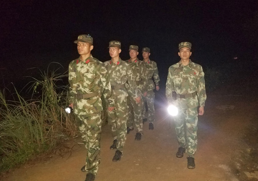 ????7月31日,在廣西梧州市蒼梧縣沙頭鎮(zhèn)參田村,武警梧州市支隊官兵在村里巡邏排查受災(zāi)情況(手機拍攝)。