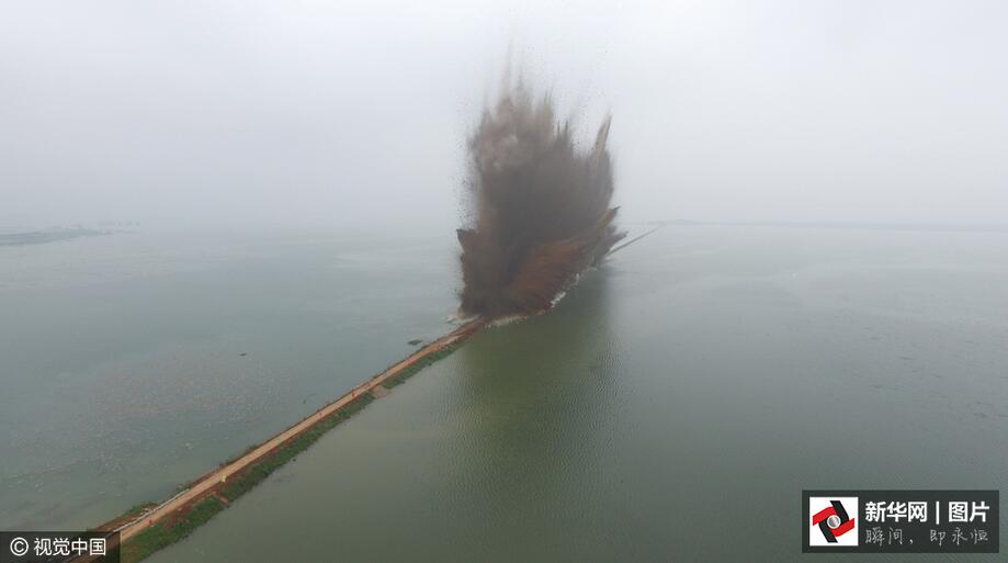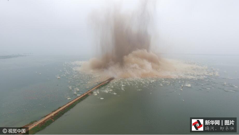 ??? 7月14日7時,伴隨著一聲聲的爆破轟鳴,梁子湖與牛山湖隔堤正式實(shí)施爆破作業(yè),這標(biāo)志著湖北梁子湖流域的牛山湖正式破垸分洪。(圖片來源:視覺中國)