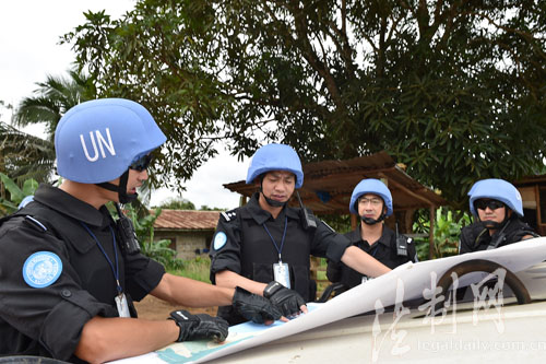 圖為防暴隊(duì)黨總支書記徐曉偉(左三)帶隊(duì)執(zhí)行利比里亞博米州武裝巡邏任務(wù)
