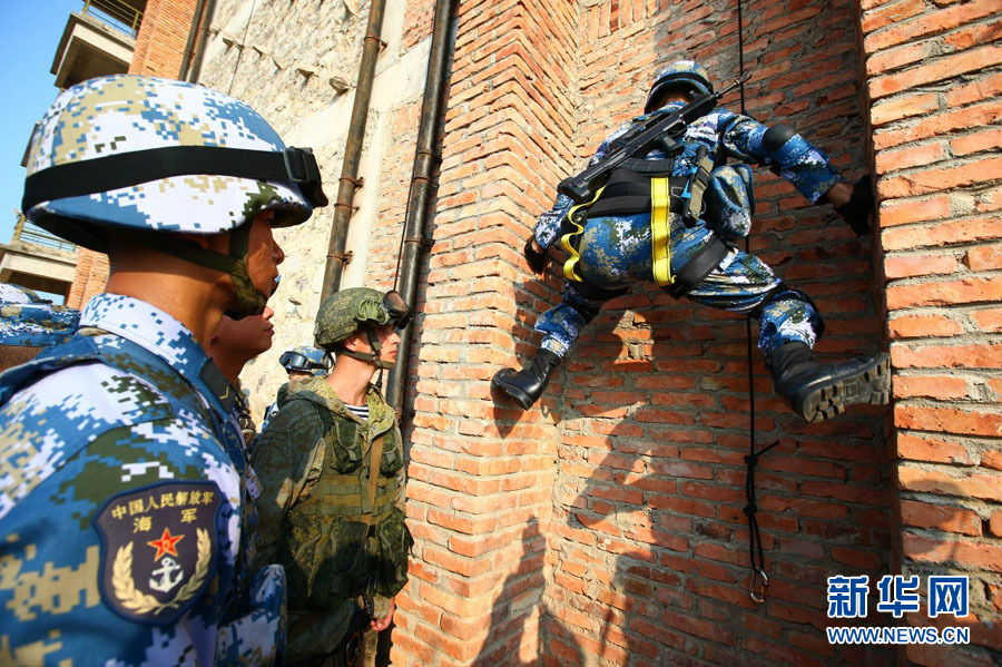 ??? 9月13日,中俄海軍陸戰(zhàn)隊(duì)隊(duì)員進(jìn)行建筑物攀登滑降訓(xùn)練。