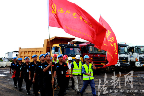 ????圖為2016年9月23日,中國第四支駐利比里亞維和警察防暴隊“海外黨員服務(wù)隊”深入中國港灣工程有限責(zé)任公司(駐利比里亞)工地,開展送服務(wù)活動,踐行“兩學(xué)一做” 鄭志剛攝