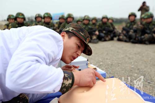 圖為在第一個(gè)休息點(diǎn)開展戰(zhàn)場救護(hù)科目教學(xué)