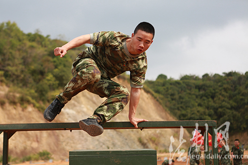 圖為大隊官兵正在快速進行障礙跑訓(xùn)練