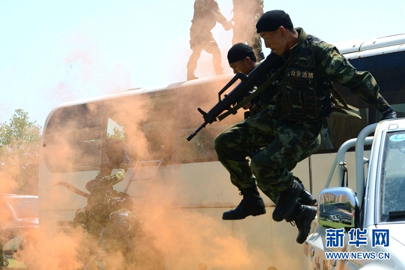 特勤隊官兵對藏匿在公共汽車內(nèi)的“歹徒”進行突擊。