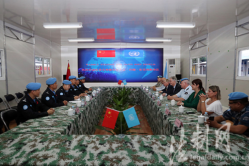 圖為維和警察防暴隊與聯(lián)利團任務支持部主任大衛(wèi)·約翰·彭克利斯一行開展座談交流