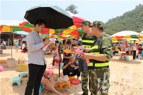 ????在天氣越來(lái)越熱的夏季,“海邊游”受到越來(lái)越多游客的追捧和青睞。尤其正值暑期,許多游客選擇帶小孩到海邊避暑。為使游客玩得舒心和盡興,廣西公安邊防總隊(duì)防城港邊防支隊(duì)江山邊防派出所針對(duì)夏季旅游景點(diǎn)溺水、小孩走失等易發(fā)多發(fā)的實(shí)際,組織官兵深入轄區(qū)景點(diǎn)開(kāi)展安全宣傳活動(dòng)。