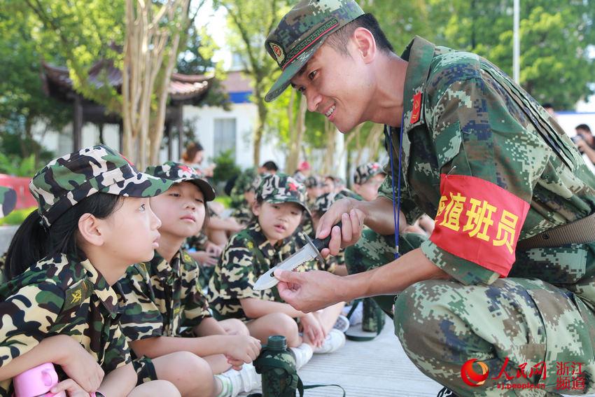 圖為帶兵骨干向?qū)W員介紹匕首。