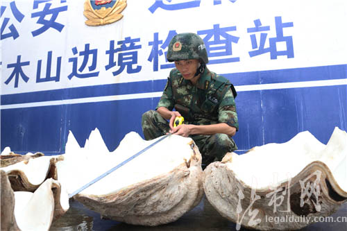 圖為邊防官兵在測(cè)量硨磲標(biāo)本