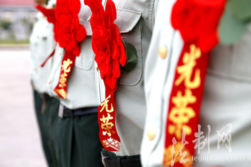 圖為退伍老兵帶上印有“光榮”二字的大紅花