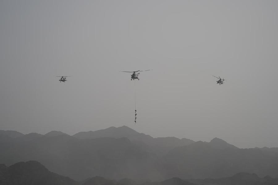 ????23日,陸軍新質(zhì)作戰(zhàn)力量演練在陸軍多個(gè)演兵場(chǎng)連續(xù)“打響”,8支新質(zhì)作戰(zhàn)力量輪番上陣。圖為特戰(zhàn)隊(duì)員在武裝直升機(jī)護(hù)衛(wèi)下進(jìn)行直升機(jī)懸吊撤離。新華社記者王東明 攝