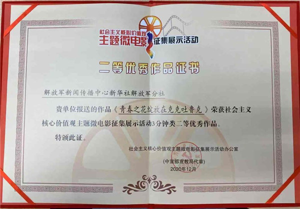 ????第四屆社會(huì)主義核心價(jià)值觀主題微電影征集展播活動(dòng)評(píng)選結(jié)果日前揭曉,解放軍新聞傳播中心新華社解放軍分社申報(bào)的《青春之花綻放在克克吐魯克》獲“3分鐘類(lèi)二等優(yōu)秀作品獎(jiǎng)”。