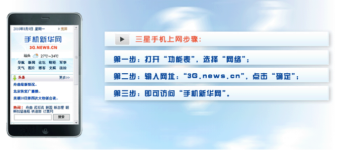 三星:依次選“上網(wǎng)鍵”-“收藏夾”-選擇一個空的收藏夾地址-確認(rèn)url地址-輸入“手機(jī)新華網(wǎng)”