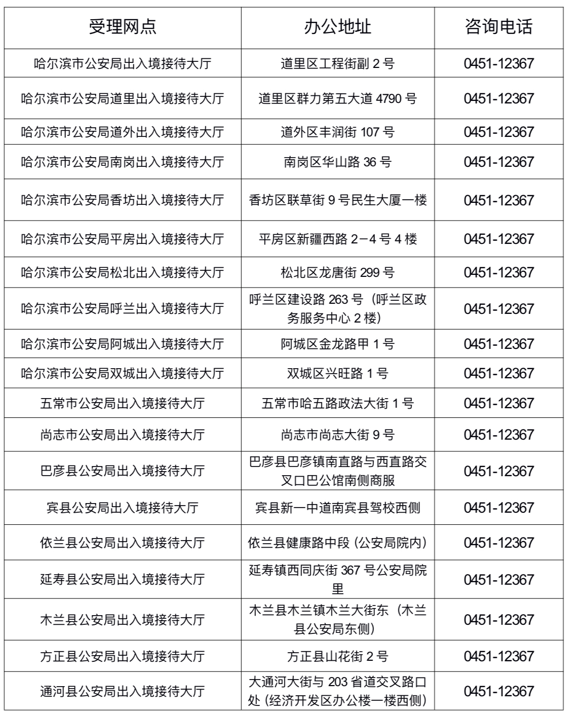 哈爾濱市公安局出入境接待大廳受理網(wǎng)點