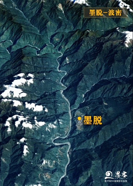 ▲從墨脫至波密縣扎木鎮(zhèn)衛(wèi)星三維實(shí)景。衛(wèi)星數(shù)據(jù)來(lái)源:高分六號(hào)