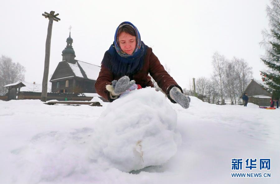 1月24日,一名女士在白俄羅斯首都明斯克郊區(qū)的民族建筑博物館內(nèi)滾雪球。新華社發(fā)(任科夫攝)