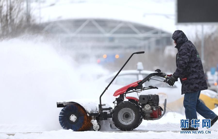 1月28日,在沈陽(yáng)市渾南區(qū),一位工作人員在奧林匹克公園清掃積雪。