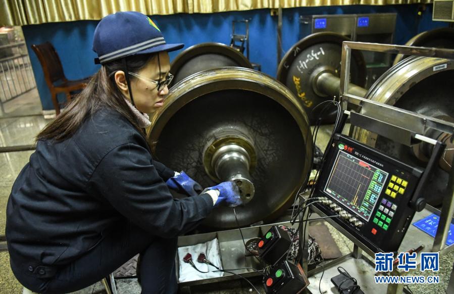 2月1日,柳州車輛段車輪車間無損檢測(cè)員黃婷對(duì)輪對(duì)進(jìn)行探傷檢查。新華社記者 張愛林 攝